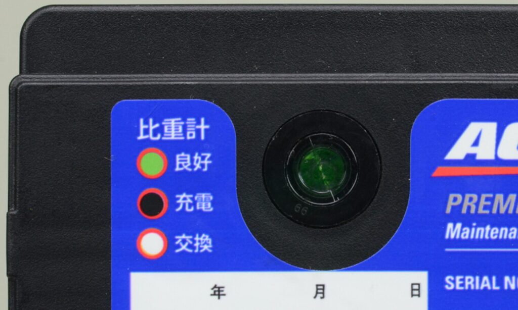 ACデルコ製の場合、緑表示が「良好」、黒表示が「充電」、白表示が「交換」となっています。