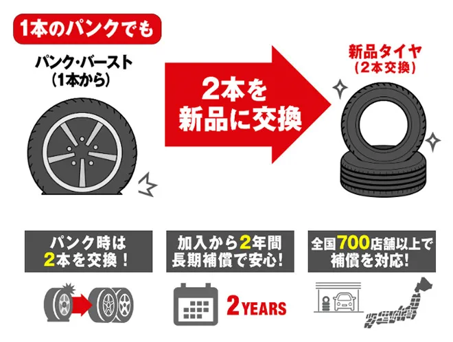 パンク時にも安心(自己負担ゼロで2本新品交換)